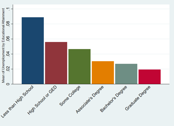 Figure 1 shows the means of unemployment by individual levels of educational attainment. According to the Figure, unemployment rates within each category decrease as the level of educational attainment increases. However, unemployment rates do not drop evenly between educational attainment categories. For example, the largest drop in unemployment rates occurred between individuals with less than high school education and individuals with a high school diploma or a GED. In the sample, the unemployment rate for individuals with a high school diploma or GED was 3.3 percentage points less than the rate for individuals with less than high school education. The second-largest drop in unemployment rates occurred between individuals with some college but no degree and individuals with associate’s degrees. The sample suggested that the unemployment rate for individuals with an associate’s degree was just .9 percentage points less than individuals with some college but no degree.
