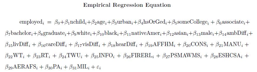 The dependent variable used will be employment status. Employment status has been split into two dummy variables: employed and unemployed.The independent variable of interest is educational attainment. Educational attainment has been split up into several finer categories (dummy variables) including Less than High School, High School or GED, Some College – DNF, Associate’s Degree, Bachelor’s Degree, and Graduate Degree. These variables were chosen because they all represent significant milestones in an individual’s educational attainment. Alongside these independent variables, this analysis will control for sex, race, age, number of children, and urban/rural status. These variables have also been made finer using dummy variables.