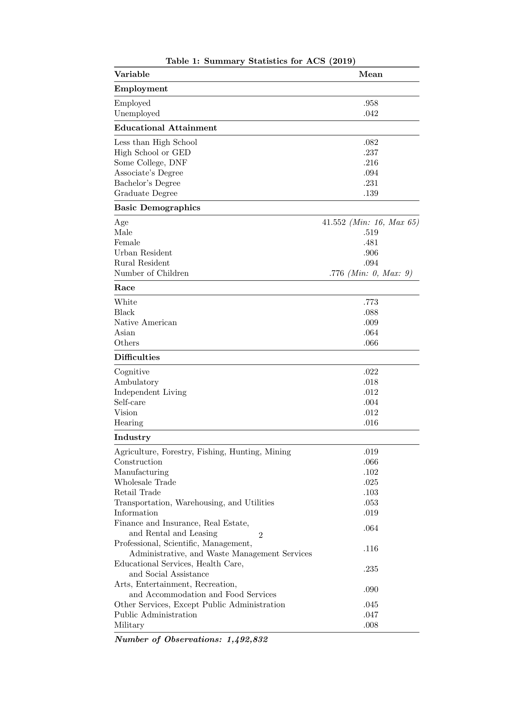 This analysis uses cross-sectional data from the 2019 American Community Survey, which is produced by the U.S Census Bureau. Individuals used in the sample are members of the labor force aged 16 to 65. These individuals reside in Washington DC or one of the other fifty states of the United States.