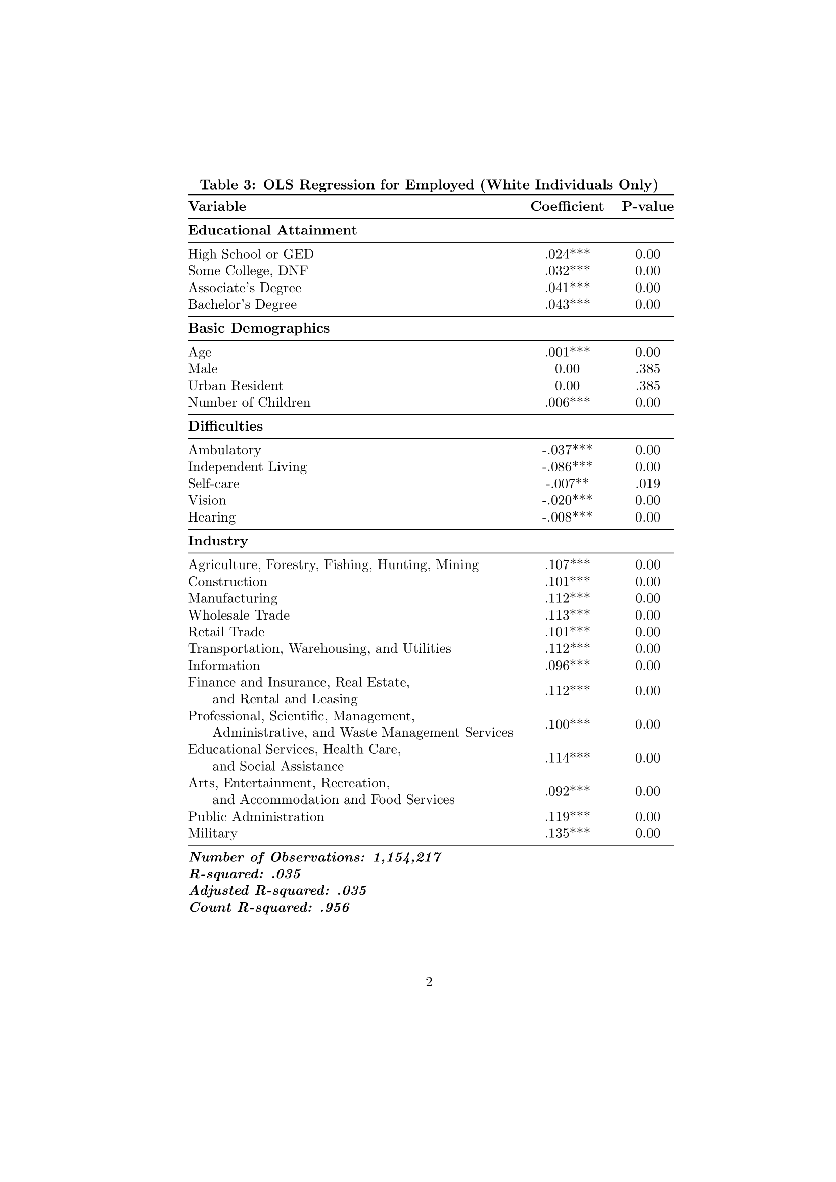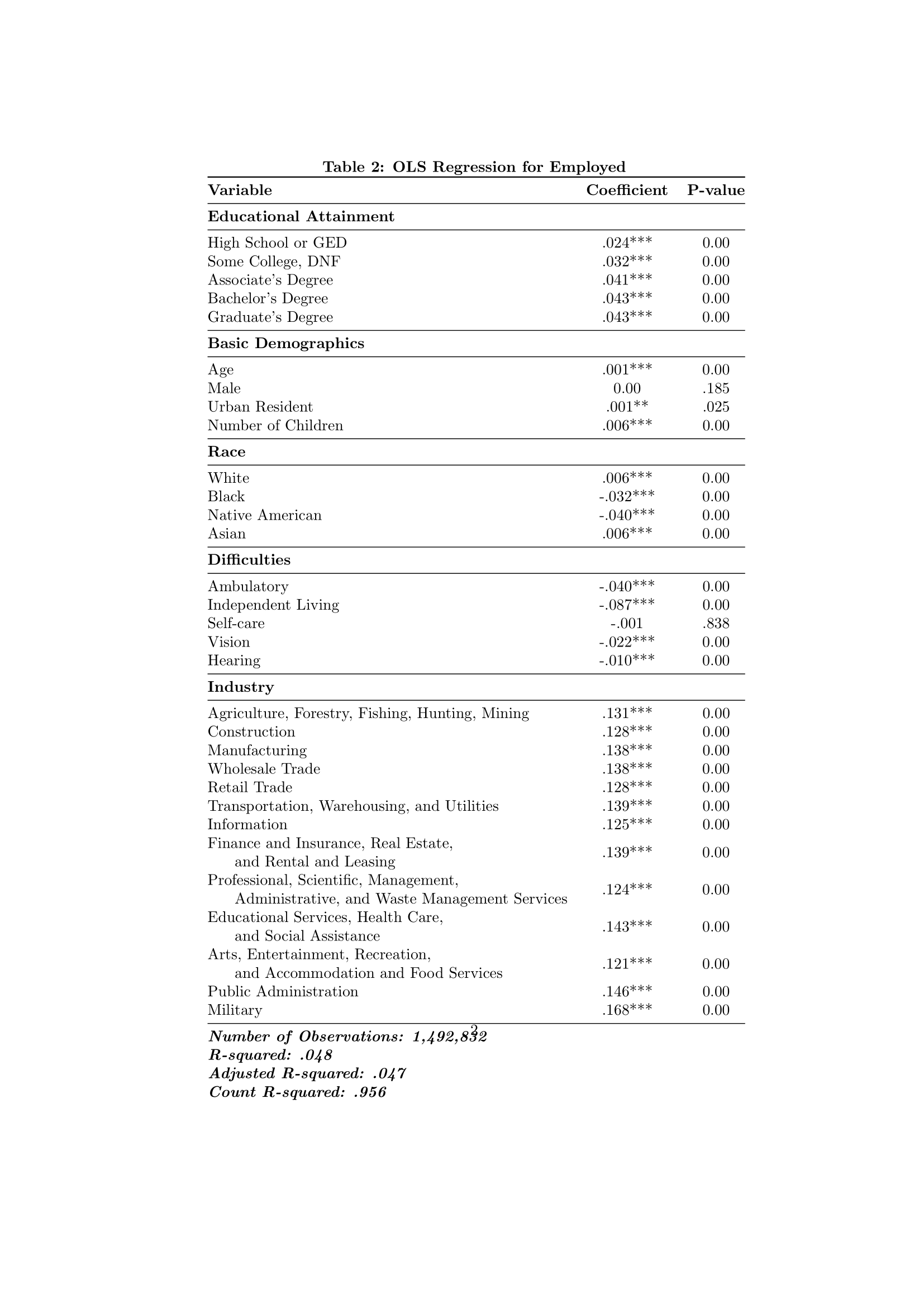Table 1 is meant to provide insights about the sample being used in this analysis. As seen in the Table, 95.8 percent of individuals in the sample are employed. The remaining 4.2 percent of individuals are unemployed.
