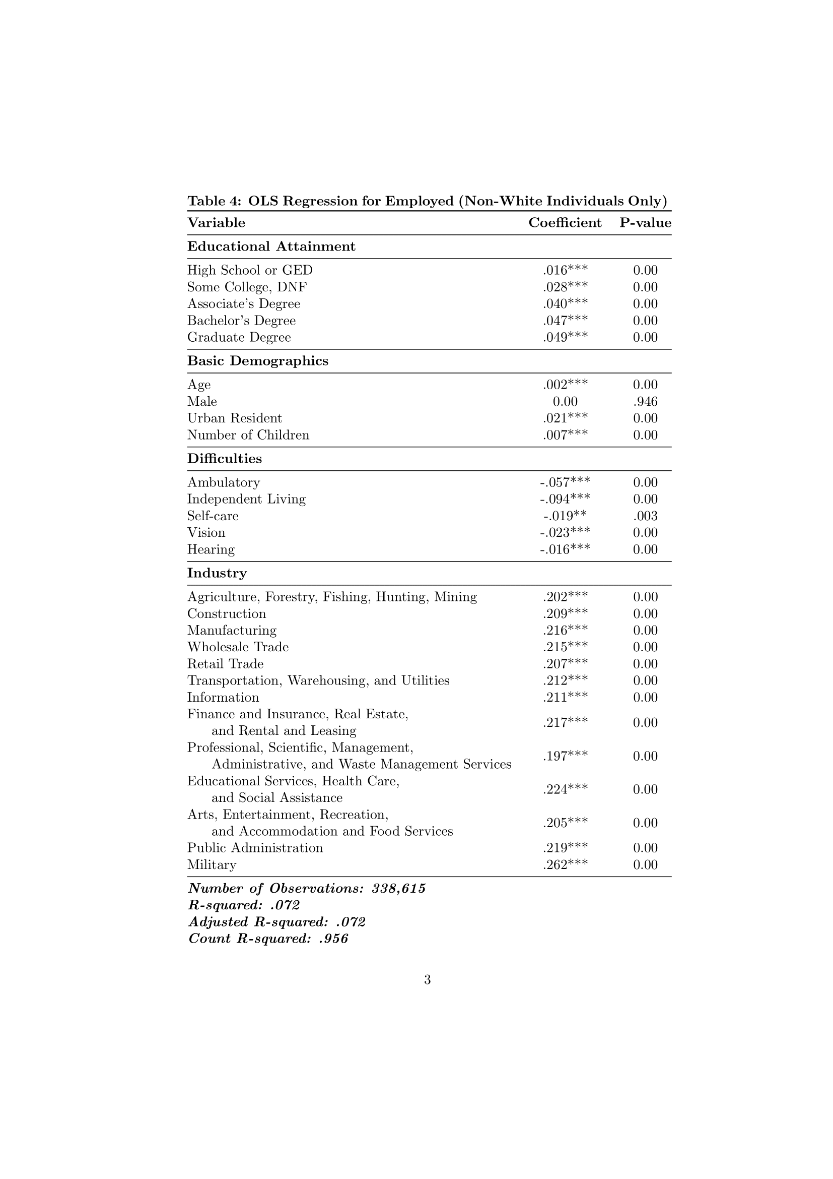 In the empirical regression, all races were statistically significant at the 1% level. However, 77.3 percent of individuals used in the regression were White. To further investigate the impact race has on employment likelihood, it’s valuable to consider regressions for White and non-White individuals separately. Both regressions are below.